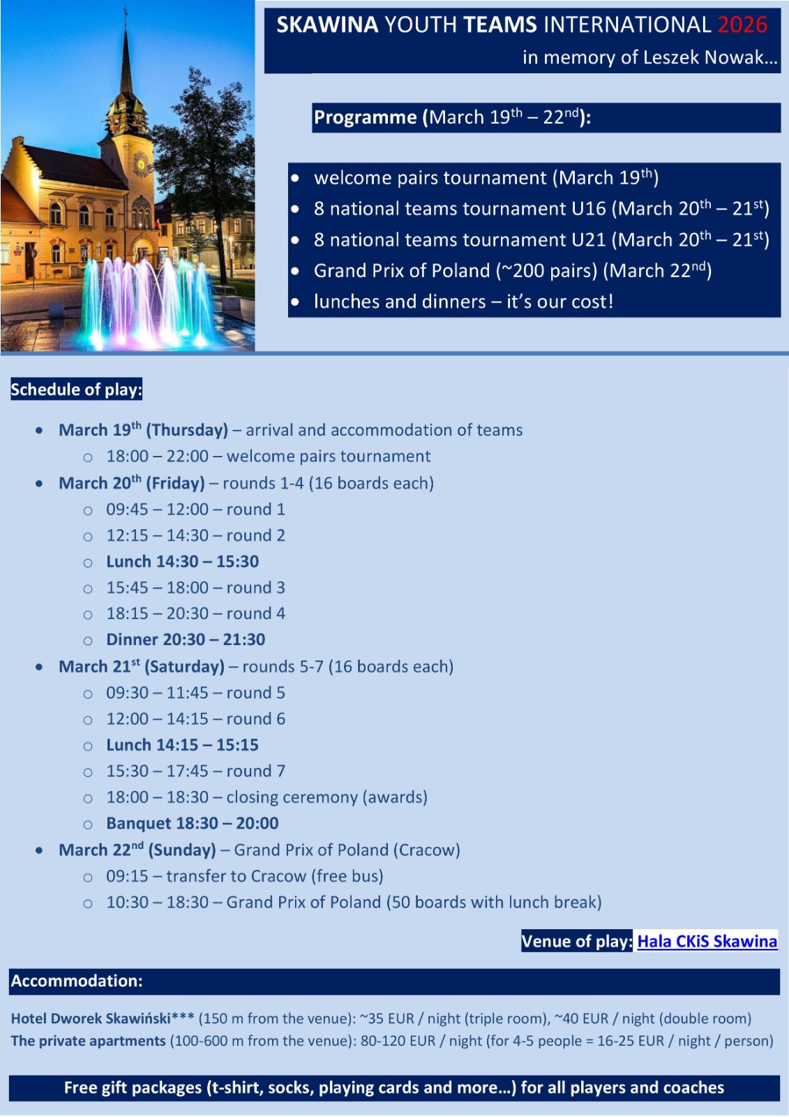 Hrací dny: 1 na hlavní soutěž párů, 1-2 dny na možné vedlejší soutěže
